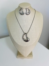 Conjunto de colar e brinco em estilo moderno, com detalhes em dourado e prateado.